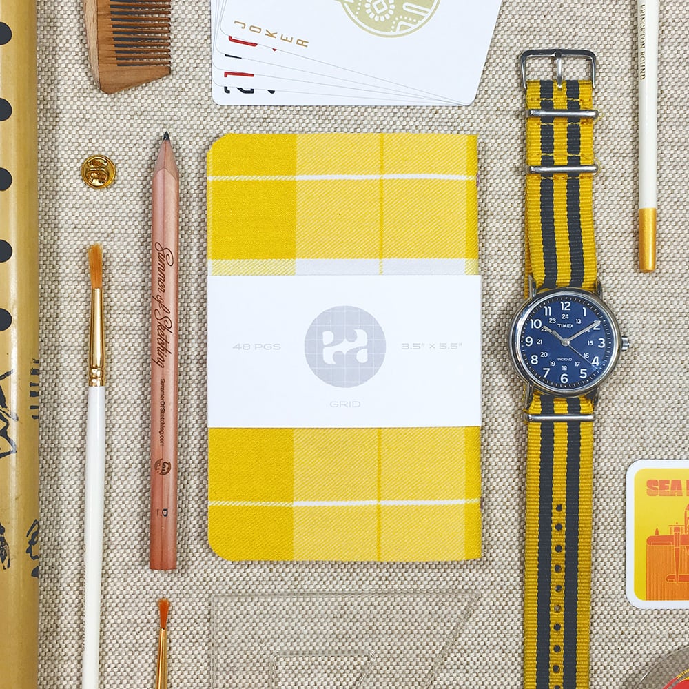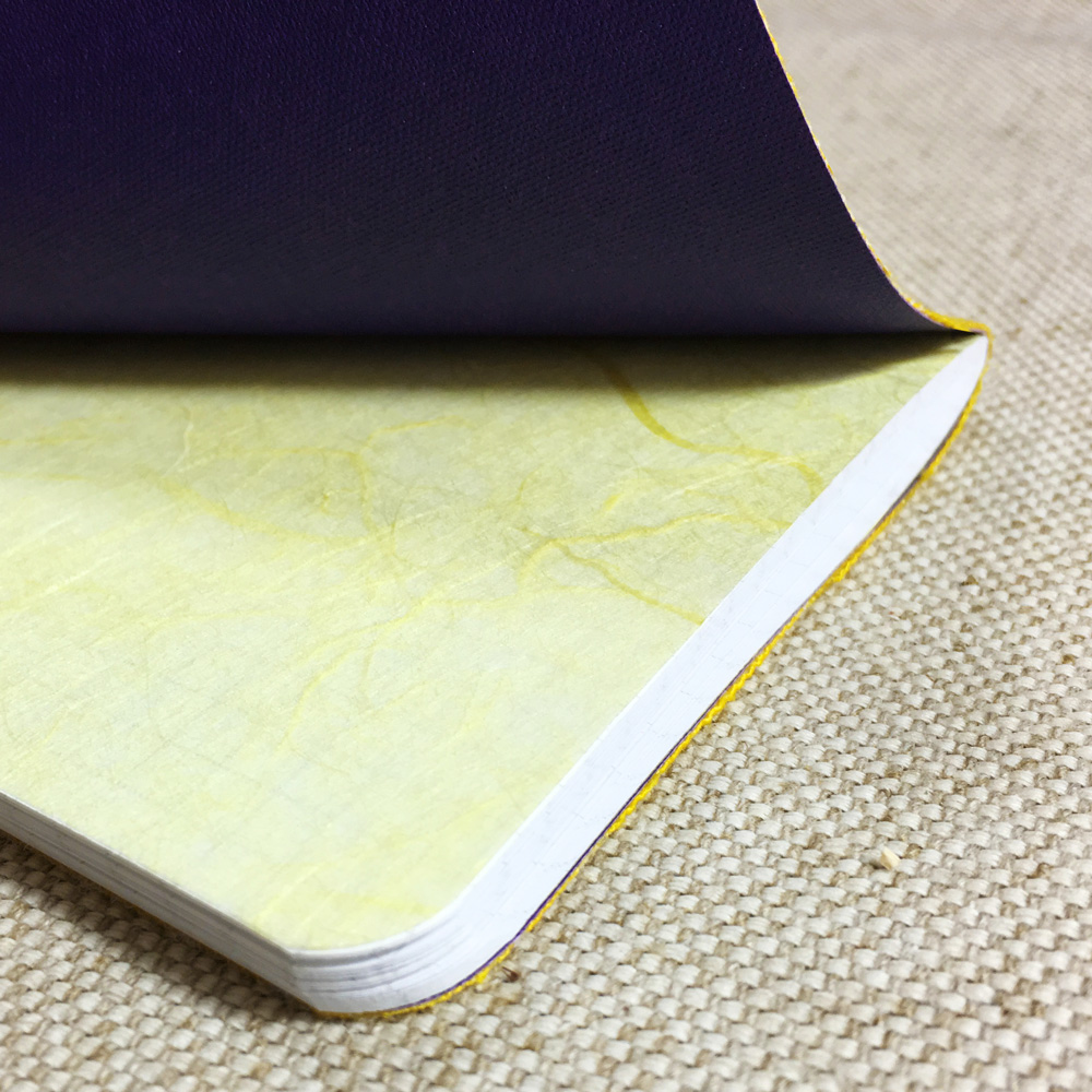 This edition contains: yellow plaid on the outside, plum inside with a yellow chiffon onion-skin layer, 48 grid pages on 70lb smooth white, and an eggplant thread finish.
